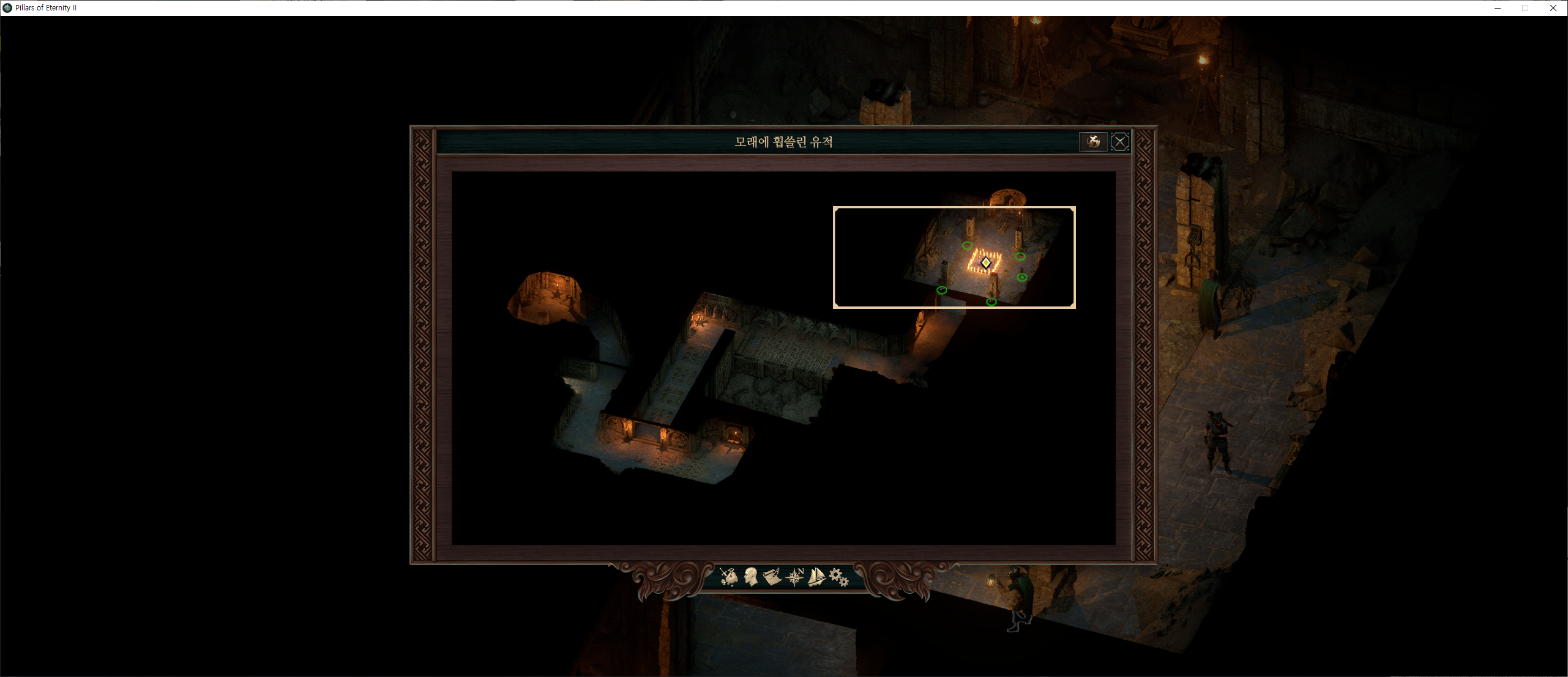 내부 진입과 동시에 함정에 걸리지 않고 조심스럽게 전진하며 함정을 해체해 나가는 것이 관건인데, 유적 가장 깊숙한 곳에 네 개의 기둥과 중앙의 화염 때문에 접근 불가한 석관이 존재합니다. 이 석관을 열기 위해서는 먼저 현재 파티에 소속된 4명의 동료를 각 기둥으로 이동시킨 후 일시 정지한 상태에서, 각 기둥에 설치된 레버를 일제히 당기게 하고 일시 정지를 해제하여 한꺼번에 레버를 당겨 중앙의 화염을 차단해야만 합니다. 그리고 석관 속의 아이템을 획득하면 문이 닫히면서 모래가 쏟아져 들어옵니다.