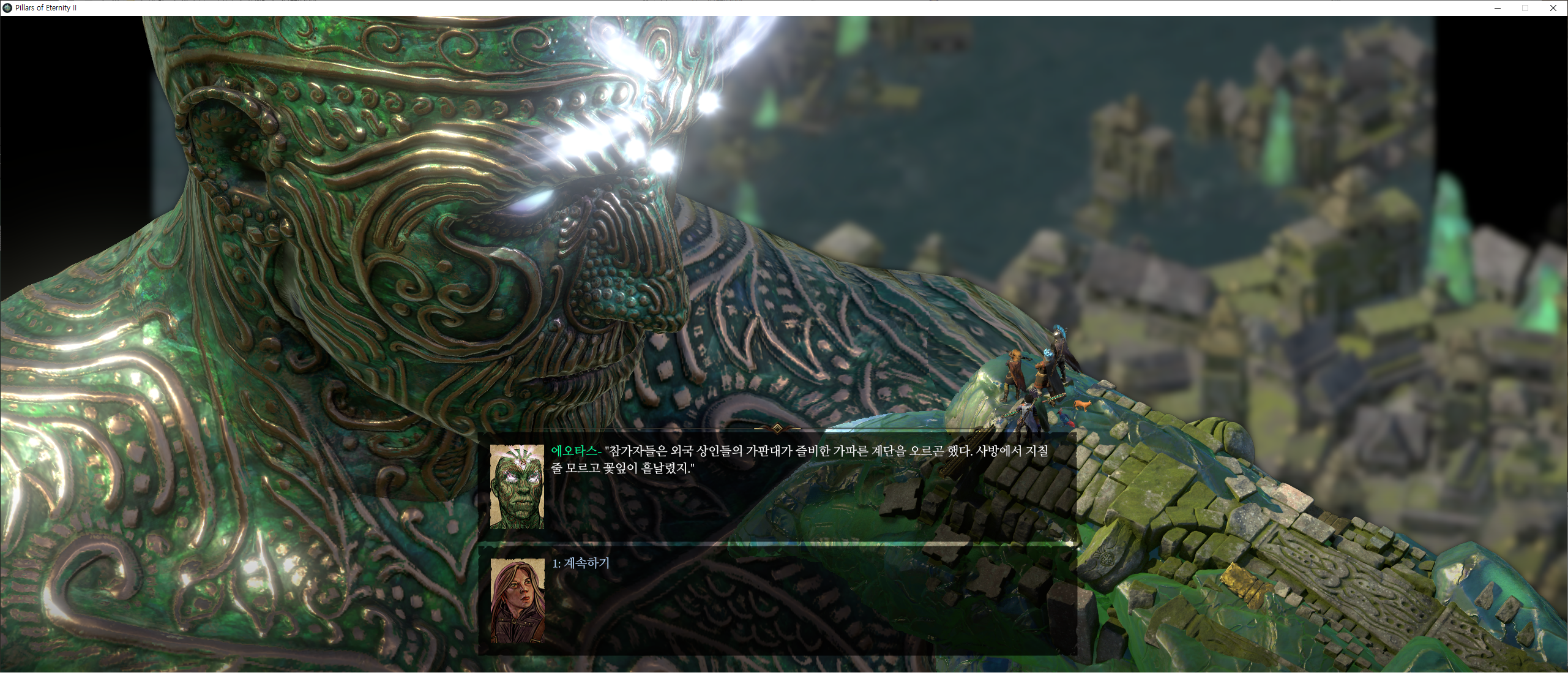 게임을 최초로 구동하면 UI의 변화가 눈에 띄고 게임 내 그래픽도 일정 수준의 향상이 이루어진 것을 확인할 수 있습니다. 이런 변화는 플레이어의 기대치를 높이지만 장시간 게임을 진행하다 보면 전작부터 추구해온 기본적인 시스템의 한계도 더욱 명확해집니다. 먼저 대사의 가독성이 향상됐다지만 방대한 분량의 텍스트는 전혀 줄지 않았습니다. 이렇게 방대한 텍스트로 완성된 게임이 그 고집을 고수하면서까지도 얻어낸 결과는 매우 불만족스러워, 전작을 이미 접해본 플레이어조차도 POE의 세계관과 사건의 인과관계를 완벽히 이해할 수 없을뿐더러 중요한 정보를 놓칠세라 꼼꼼히 지문을 읽어야 하는 통에, 게임 진행 시간만 터무니없이 늘리고 있는 것은 아닌지 매우 우려스럽습니다. 더불어 전작에서 제기됐던 잦은 맵 로딩과 버그 및 최적화 문제가 개선되지 않아 플레이어들의 발목을 잡습니다. 화면 전환이 매끄럽지 않은 것은 기본이고 아이템을 줍는 행위가 되지 않아 화면 전환 후 재시도해야 하거나 아이템 거래 후 캐릭터 조작이 일시 불가한 문제, 빈번하게 발생하는 캐릭터 이동 불가 상태, 새로운 지문 추가 없이 반복적으로 대화를 요청하는 동료 간의 상호 작용 시스템 등 아직 고쳐져야 할 문제들이 산적해 있습니다.